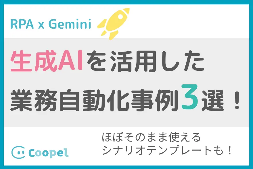 ここでは、RPAツールの一例として「Coopel」を用い、生成AIと連携した実践的なシナリオを紹介します。各シナリオでは、操作画面の動画を交えながら、設定の流れをステップバイステップで解説します。